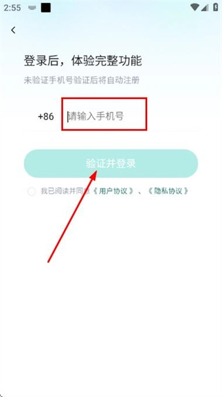 在登录页面输入手机号,勾选相关协议后,点击“验证并登录”按钮即可完成操作。
