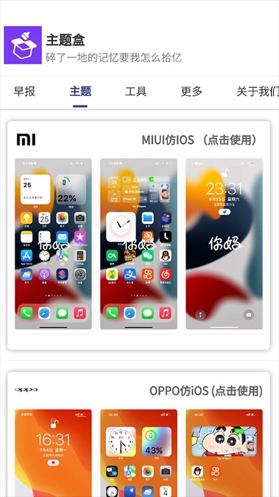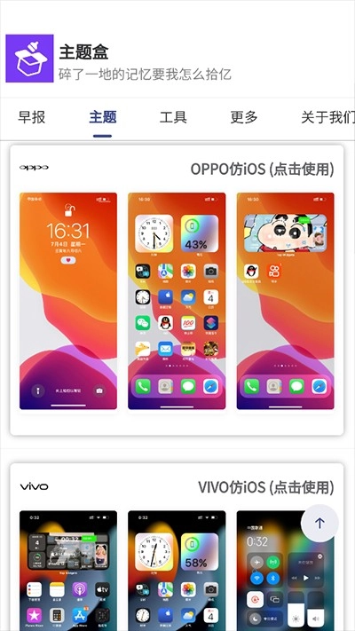 首先打开主题盒,在首页能看到多款仿iOS风格的手机型号主题可供使用。