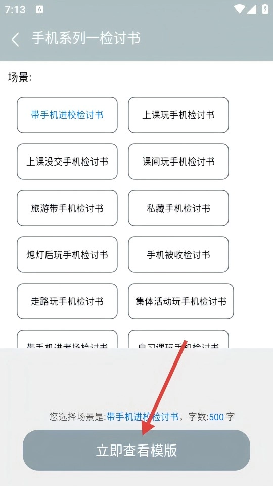 选择【带手机进校检讨书】这一场景,点击【立即查看模板】,即可获取对应的500字范文内容。