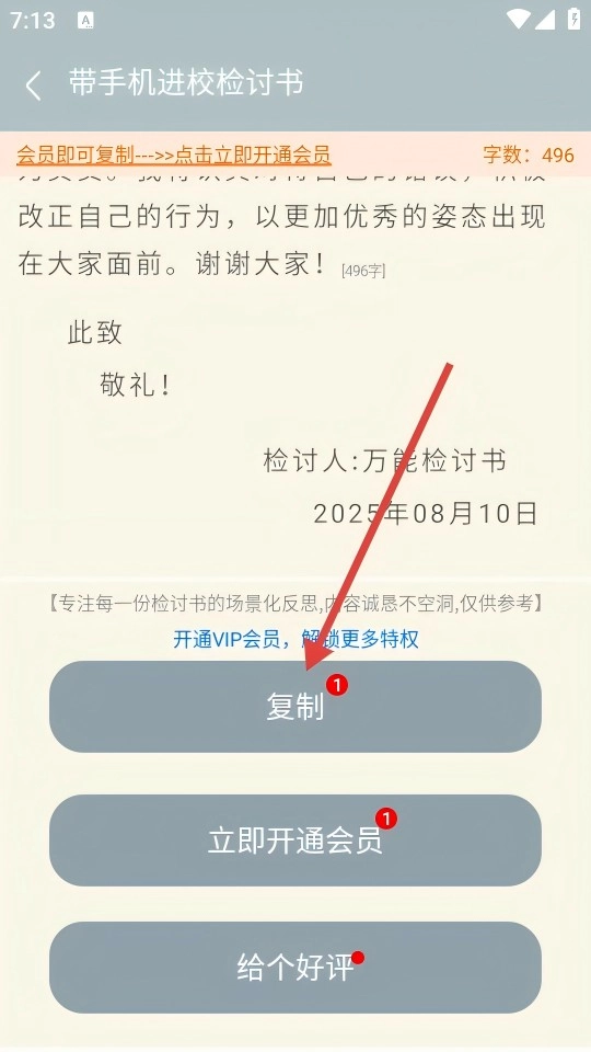 范文页点击【复制】按钮,即可完成内容复用;若想解锁更多特权,可选择开通会员。