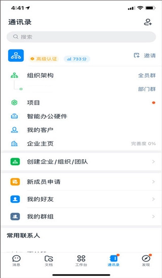 通讯录里包含组织架构、智能办公硬件、企业主页、创建企业/组织/团队、我的好友、我的群组、常用联系人等功能模块。