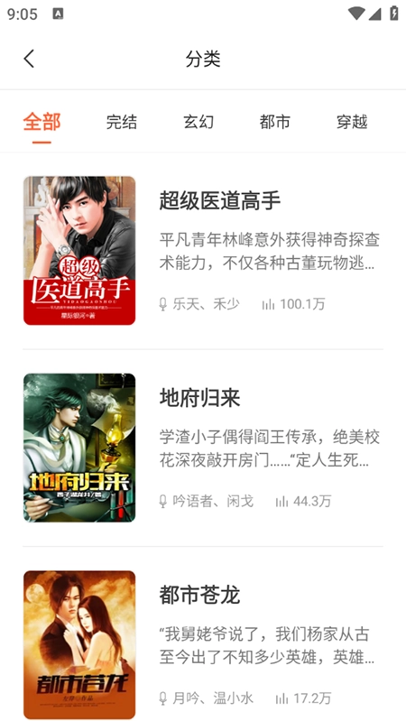 也可以在首页点击“都市”“玄幻”等分类标签,浏览对应题材的作品,挑选感兴趣的有声书进行播放。