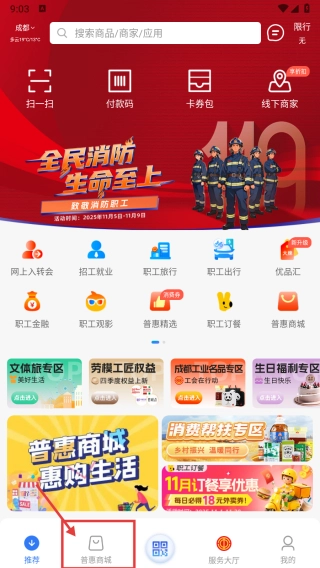 打开电商类应用,点击底部的普惠商城选项,即可进入普惠商城页面。