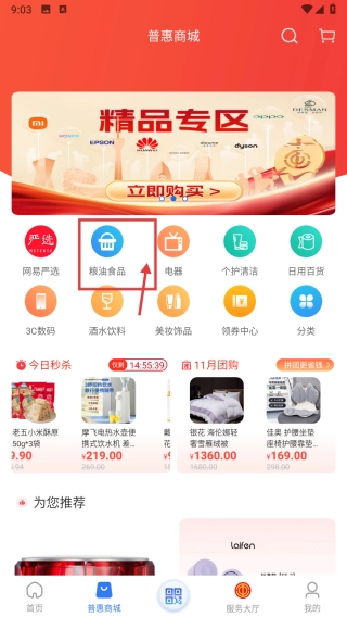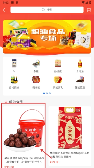 在普惠商城页面,点击粮油食品分类标签,进入粮油食品商品列表页。