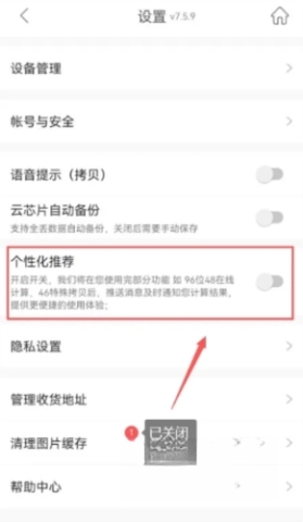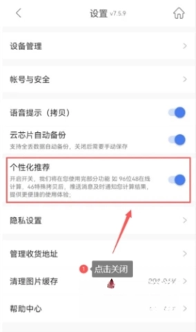 点击关闭个性化推荐功能开关(红圈部分)。