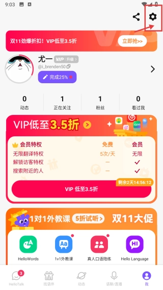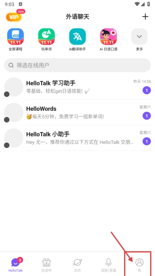 打开外语学习类应用,点击底部的“我”选项,即可进入个人中心页面。