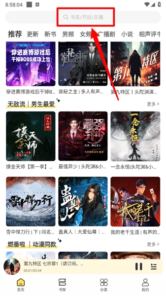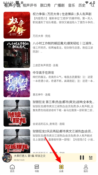 切换到“分类”板块后,可滑动顶部的分类栏,选择想要的板块来听书。