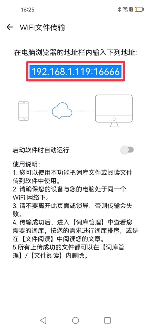 使用 WiFi 文件传输功能导入词典文件到软件: