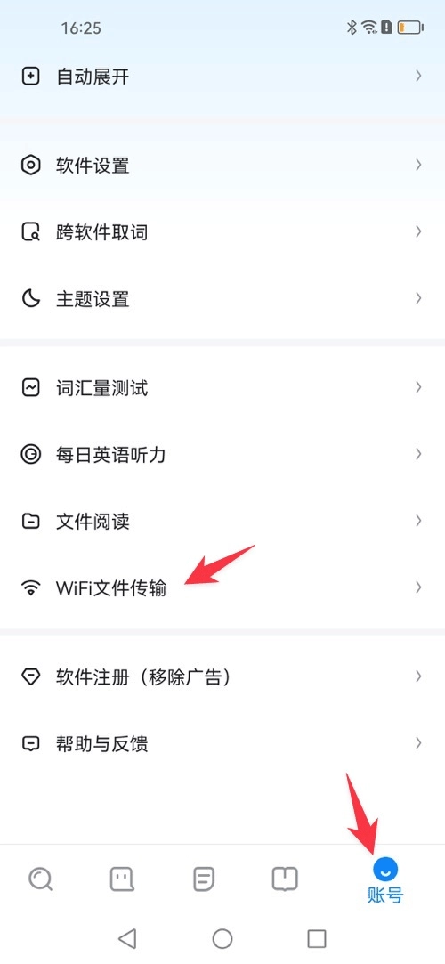 以欧路词典为例,点击账号Tab下的WiFi文件传输功能。