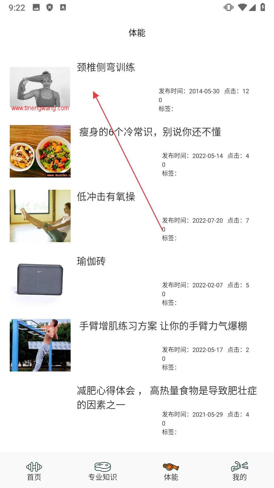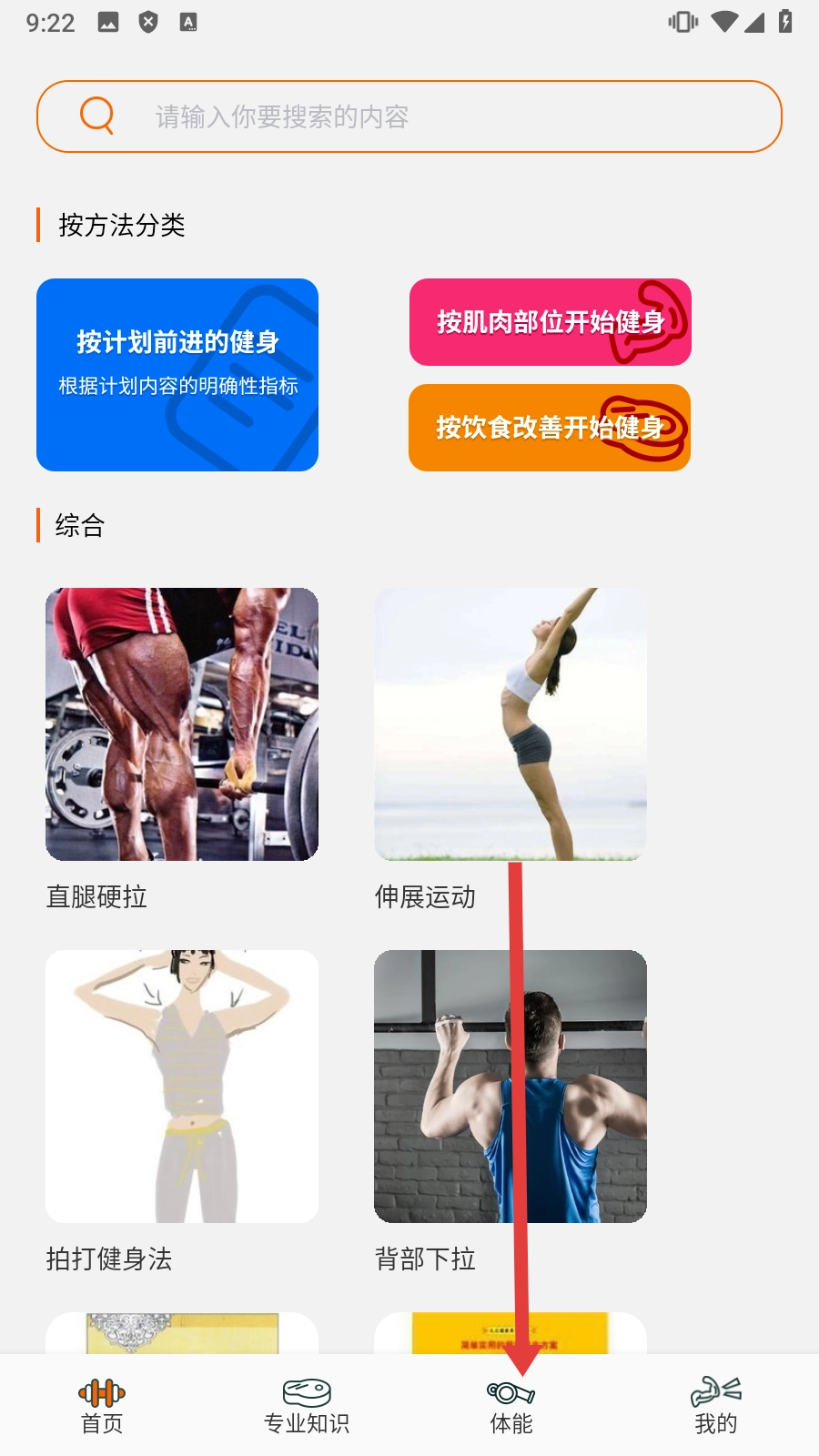 点击底部【体能】,进入体能内容页面。