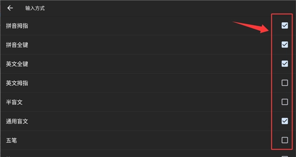 在设置页勾选拼音拇指等输入方式,完成个性化配置。