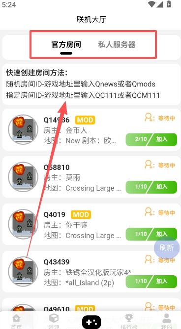 点击底部栏居中位置,进入联机大厅。