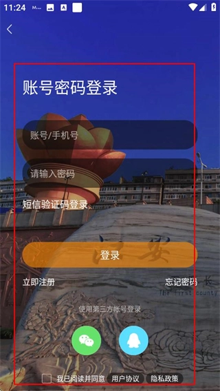 在账号密码登录界面,填写相关信息,勾选对应的协议后点击登录按钮,即可完成账号的登录操作。