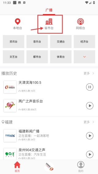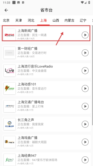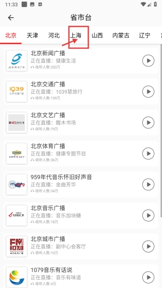 在省市台页面,点击上海地区标签,即可进入上海地区电台列表页面。