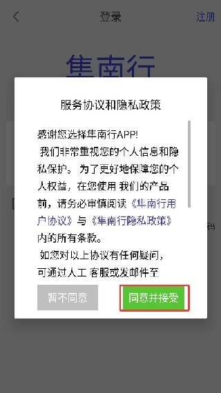 首次打开应用时,需要先点击同意用户协议的弹窗,之后才能进入登录界面。