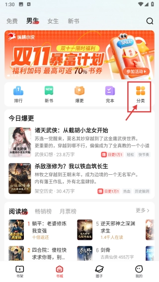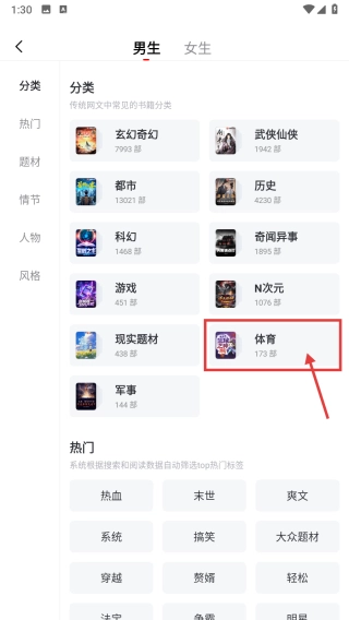 在分类页面,点击体育分类标签,即可进入体育类小说列表页面。