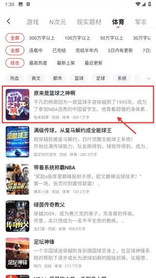 在体育类小说的列表页面里,找到《原来是篮球之神》这本小说并点击查看。