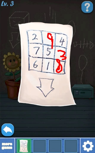 我从向日葵花盆里取出图纸并查看,发现是一道九宫格数字谜题。经过一番推算,得出从上到下对应的数字依次为9、3、8。