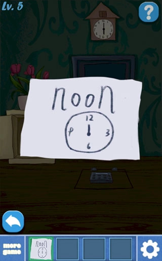移开地毯找到一把钥匙,用这把钥匙打开小柜子,取出一张图纸,上面的提示是“noon”,指的是正午12点。