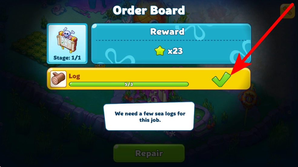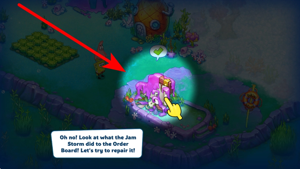清理之后,能看到被果酱风暴损坏的订单板,接下来要开始修复工作。修复时得用到特定材料,像海原木之类的,要注意关注收集这类材料的任务提示。