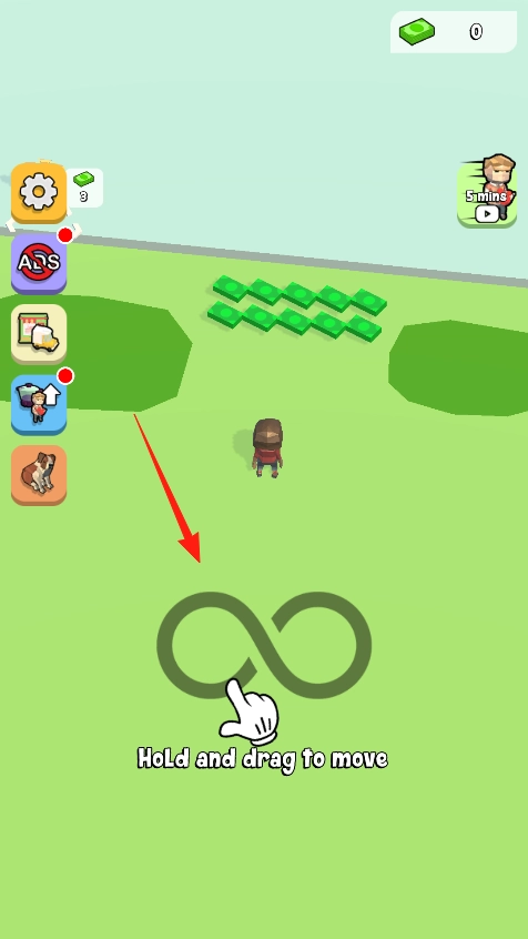 进入户外场景后,按照提示“Hold and drag to move”操作——长按屏幕并拖动,以此来控制角色移动方向。让角色朝着绿色钞票的位置前进,捡起钞票积累财富,同时探索整个场景,完成收集类的闯关任务。