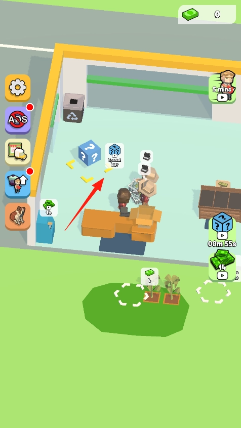 进入超市场景后,地上会出现带问号的方块,点击箭头所指的那个方块,打开后就能获得随机道具,比如金币或新物品等。这些道具可以帮助你在超市里完成购物任务,让逛超市的过程变得更有趣味。