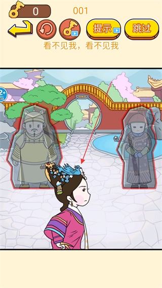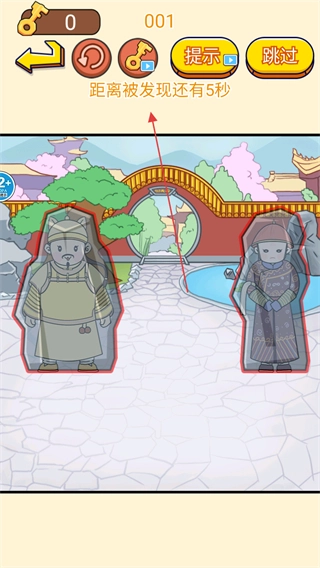 进入游戏关卡后,注意观察距离被发现的10秒倒计时,要迅速挑选合适的躲藏地点,像石像后面就是不错的选择。