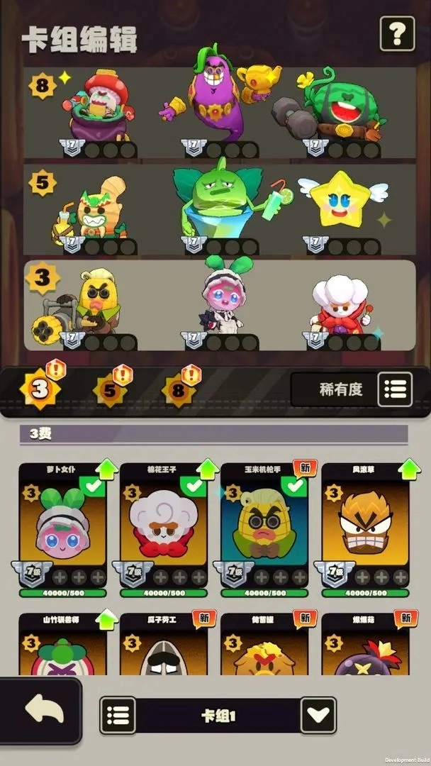 中速猩猩流玩法:三费阶段上自动升级、捣蛋鬼(主要用于过渡前期,通常不用升到三星就能卖掉,解锁的随机幽灵卡可以视情况替换)和箱子;六费阶段补上加攻速、随机卡以及研究员;九费阶段再挂上猩猩、进化和加攻击。这套阵容的优势在于面对大部分中后期阵容都具备一战的能力,原因是自动升级搭配研究员能稳定保障战力,要是运气好刷到猩猩并顺利成型,强度更是无解。