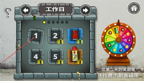 进入工作日界面后,根据提示点击标有数字1的格子,完成对应的任务就能领取当日奖励,该界面还会显示第二天的奖励为法拉费尔歌曲磁带。