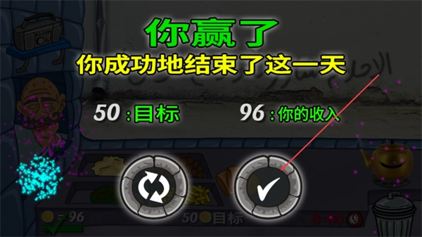 当界面出现“你赢了”的提示且显示成功结束这一天后,查看目标达成情况与你的收入,点击带有对勾标识的按钮,就能完成当前关卡的流程。