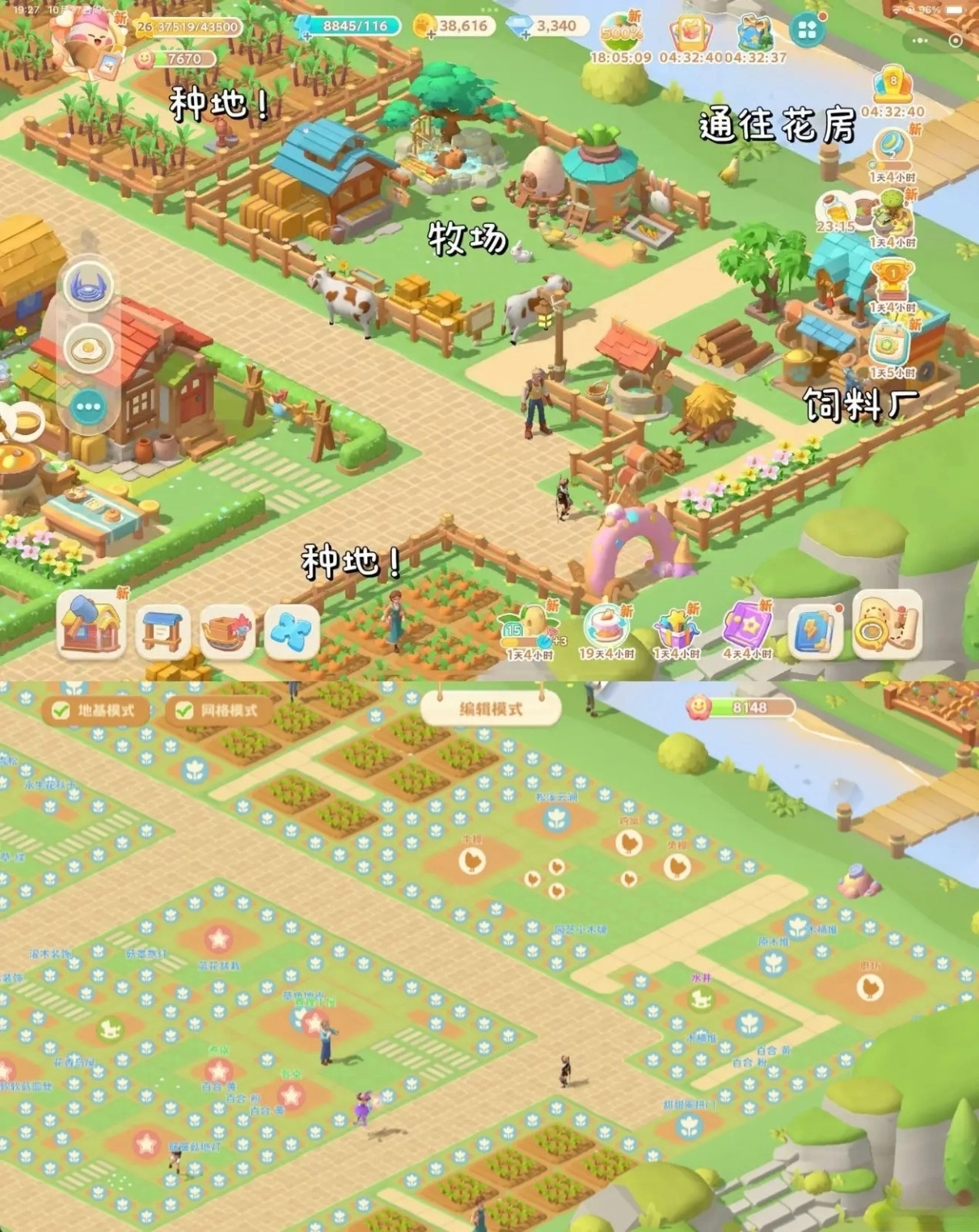 农田里能种各种各样的作物,提醒一下!游戏里的牛和鸡会四处走动,可别让它们把你的农田糟蹋了!