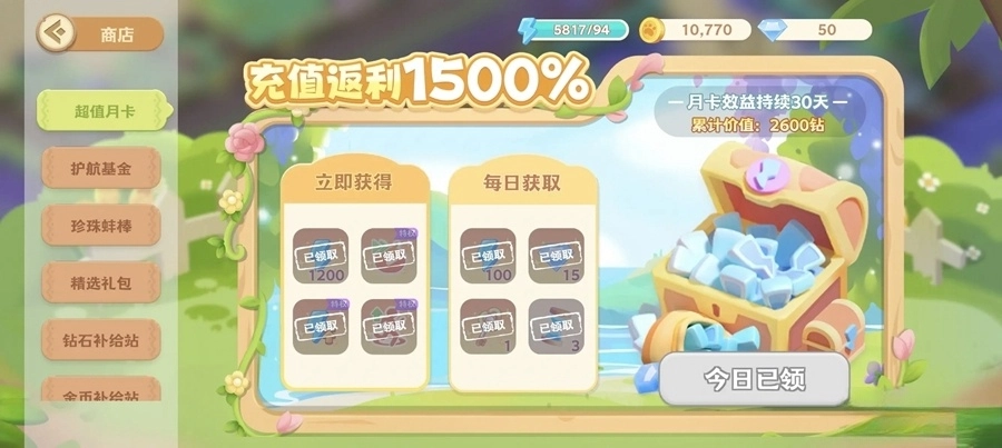 内容:钻石*10、体力*30、金币*200