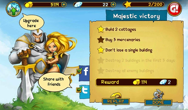 第一步,我们用25颗钻石买下寺庙。游戏开始后,先把村庄建造满。接着,先升级城堡,再升级村庄,这个阶段不要购买士兵。等到第三天敌人撤退后,把所有村庄卖掉,然后全部用来建造寺庙。当晚上敌人前来攻击时,在最后面的建筑后面建造一个泰坦,这样敌军的火力就会被泰坦吸引。之后,我们攒够11000信仰值,制造出四个泰坦,直接消灭对方。