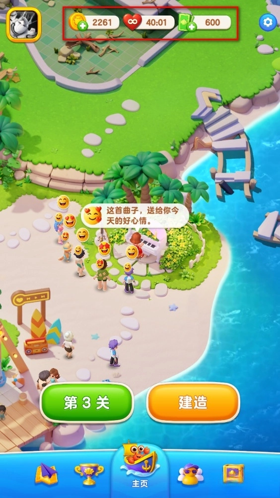 《欢乐消消时光》是一款以海岛度假为主题的消除闯关游戏,其卡通幽默的画风为玩家打造了轻松休闲的游戏氛围。在游戏过程中,玩家需通过消除相同方块来完成关卡挑战,而闯关成功所获得的奖励,还可用于打造专属于自己的度假小岛。