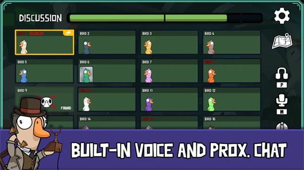 太空鹅鸭杀中文版的设计天然地提供推理与讨论的机会,得益于左右分割、通道有限的船舱布局,玩家可以根据遗体的发现位置来缩小疑犯的范围,并在紧急会议后派人跟踪被怀疑玩家,进而敲定伪装者。不仅如此,游戏独立语音系统,玩家再也不需要第三方软件来进行语音交流,能够直接在游戏中发表自已的言论,拥有更加精彩的游戏体验。