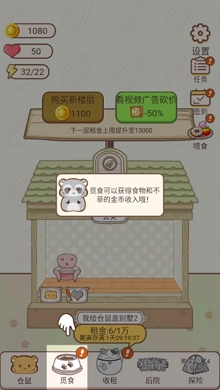 觅食玩法:仓鼠体力恢复后,记得多去觅食,这样就能获得金币和食物啦。