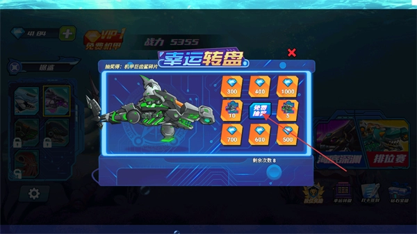 在幸运转盘界面,点击免费抽奖同样有机会获得钻石或者机甲鲨鱼的碎片。
