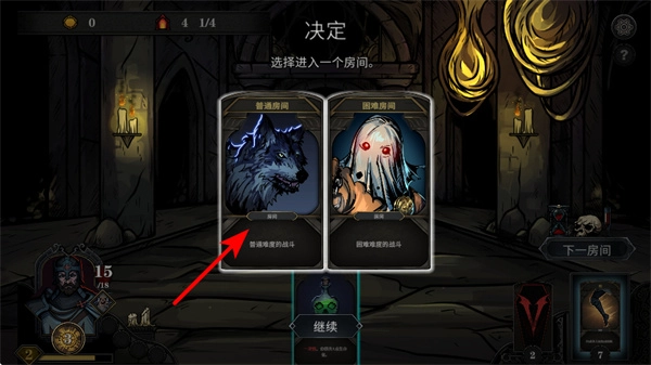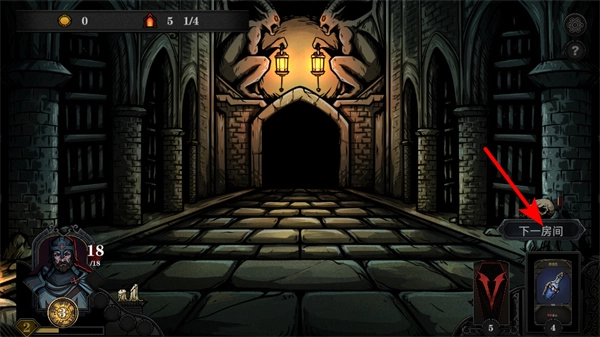 击败敌人后点击“下一房间”即可进入新场景,进入前可以留意场景的布局以及可能出现的敌人,为接下来的战斗做好准备。