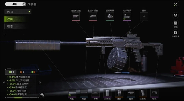 下面以最常用的SG-12为例进行示范。SG-12还有个名字叫“龙息喷”,改装它主要是为了提升爆发速度,从而抢占先手优势,再搭配龙息弹的燃烧效果,用最快的速度压制住对手。因此,改装的思路也很清晰:缩短跑射所需的时间,减小后坐力,同时提高子弹的精准度。