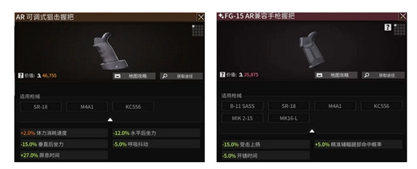 交战距离同样会对配件的选择产生影响。AR可调式狙击握把有助于减少枪械的后坐力,FG-15兼容手枪握把则能够降低受击时的上扬幅度,并且可以提高辅瞄命中腿部的几率。所以,AR可调式狙击握把比较适合在中远距离的作战场景中使用,FG-15兼容手枪握把则更适用于室内作战场景。