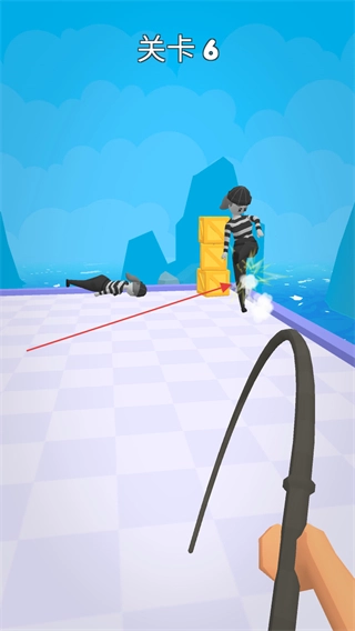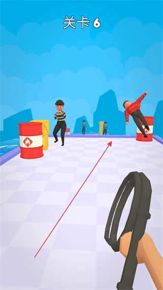 在第6关里,对准穿着条纹服饰的目标对象,用皮鞭发射过去缠住他们。