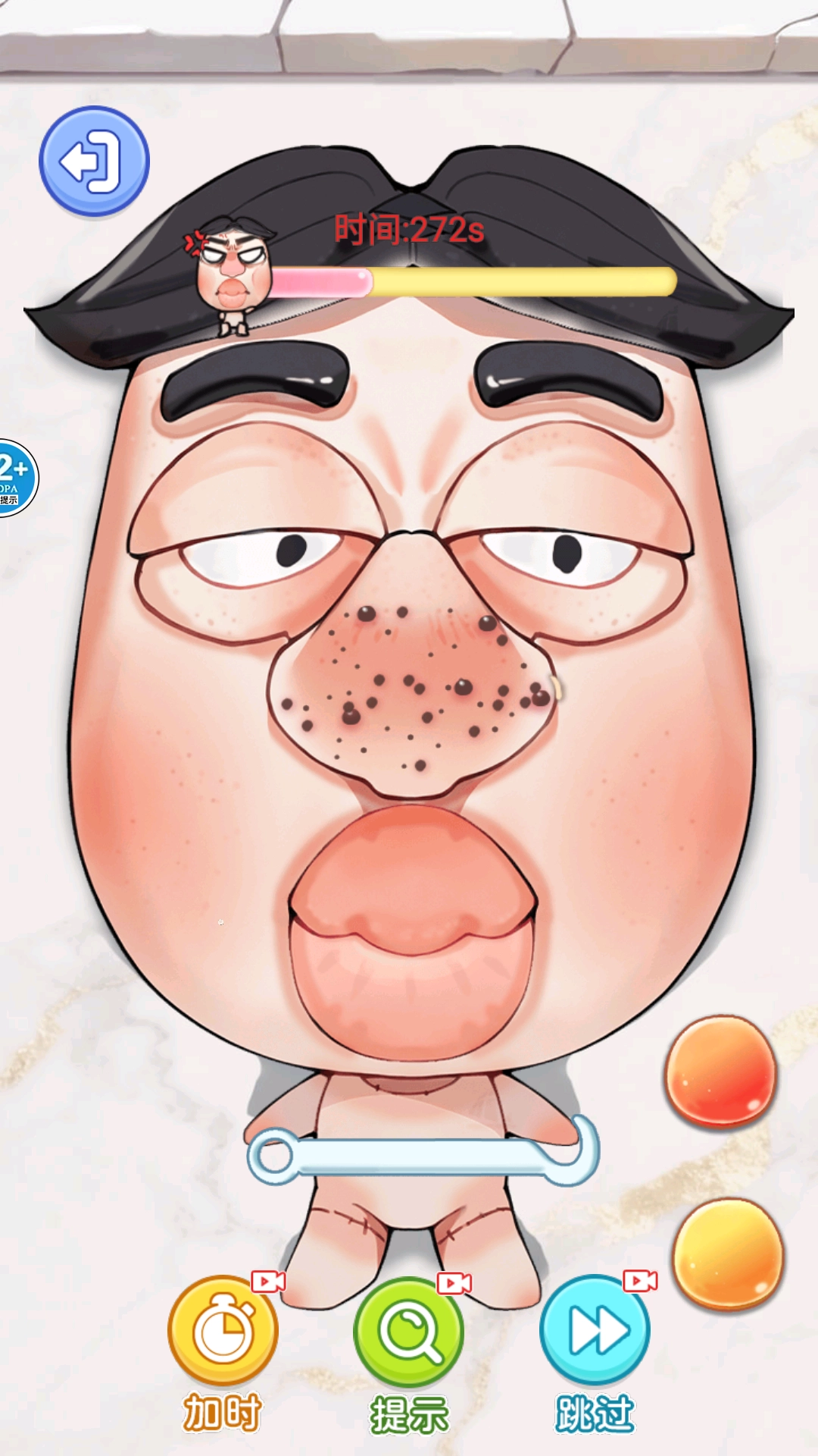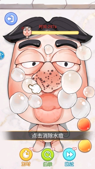 就像图里展示的那样,我选了挤痘小人这个关卡,得在五分钟内把痘痘和黑头都清理好才算通过这一关。