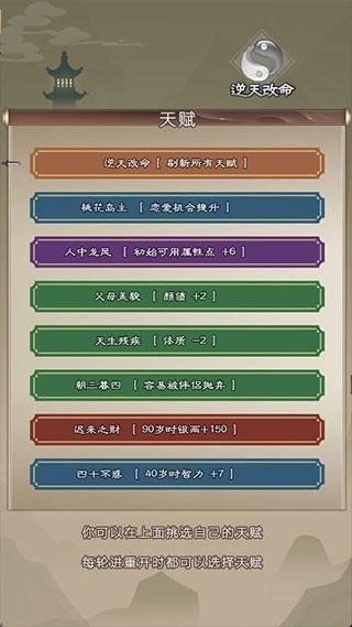 初始设定:玩家能够选择经典模式开启游戏,首先挑选一个天赋,点击“逆天改命”可以刷新当前展示的所有天赋,接着把初始拥有的10点属性点分配到臂力、体质、运气与悟性这几个属性上,不同的分配比例会触发对应的专属事件。