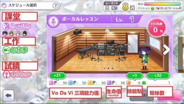 【课堂】的主要作用是提升Vo、Da、Vi这三项能力值,而这三项能力值会直接影响试镜时Appeal的分数。