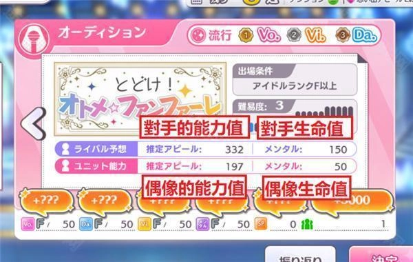当你选择参与试镜时,在对应的画面里能看到自己和对方的各项能力值。要是发现对方的能力值或者生命值比你高出不少,或许你就该先去培养偶像,或者换个难度更低的试镜来参加了。