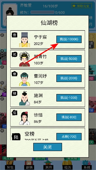 在仙湖榜界面能够挑战其他修仙者,挑战的时候要留意对方的战力要求,挑战成功之后可以提高自身的排名和修为。
