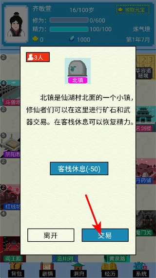 进入像北镇这样的城镇后,点击交易选项就能进入市场界面,在交易过程中可以购买矿石、武器之类的资源,这些资源能够用来进行修仙修炼以及装备强化操作。