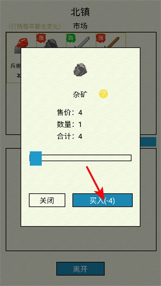 当在市场里看到像杂矿这类可以购买的物品时,点击“买入”就能得到该物品,把这些资源积攒起来,就能在后续的修仙过程和装备打造中派上用场。