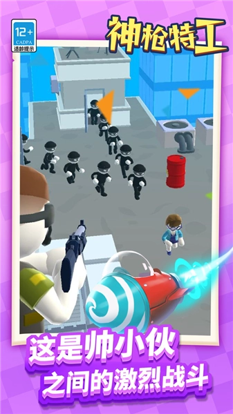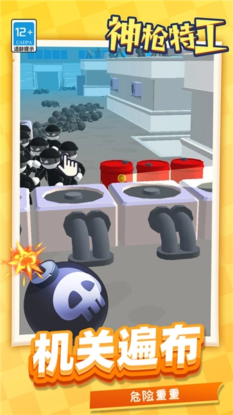 敌人涵盖普通匪徒、重装士兵、炸弹客等多种类型,玩家能够升级步枪的射速、换弹速度、穿透力等属性,以此来应对不同的威胁。