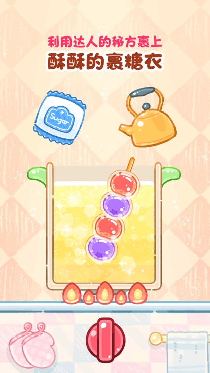 玩家需要从挑选水果(草莓、蓝莓、年糕等)、熬制糖浆到裹糖成型,完整还原传统糖葫芦的制作工艺。同时创新融入甜辣、麻辣等非常规口味,以此满足顾客的猎奇需求。